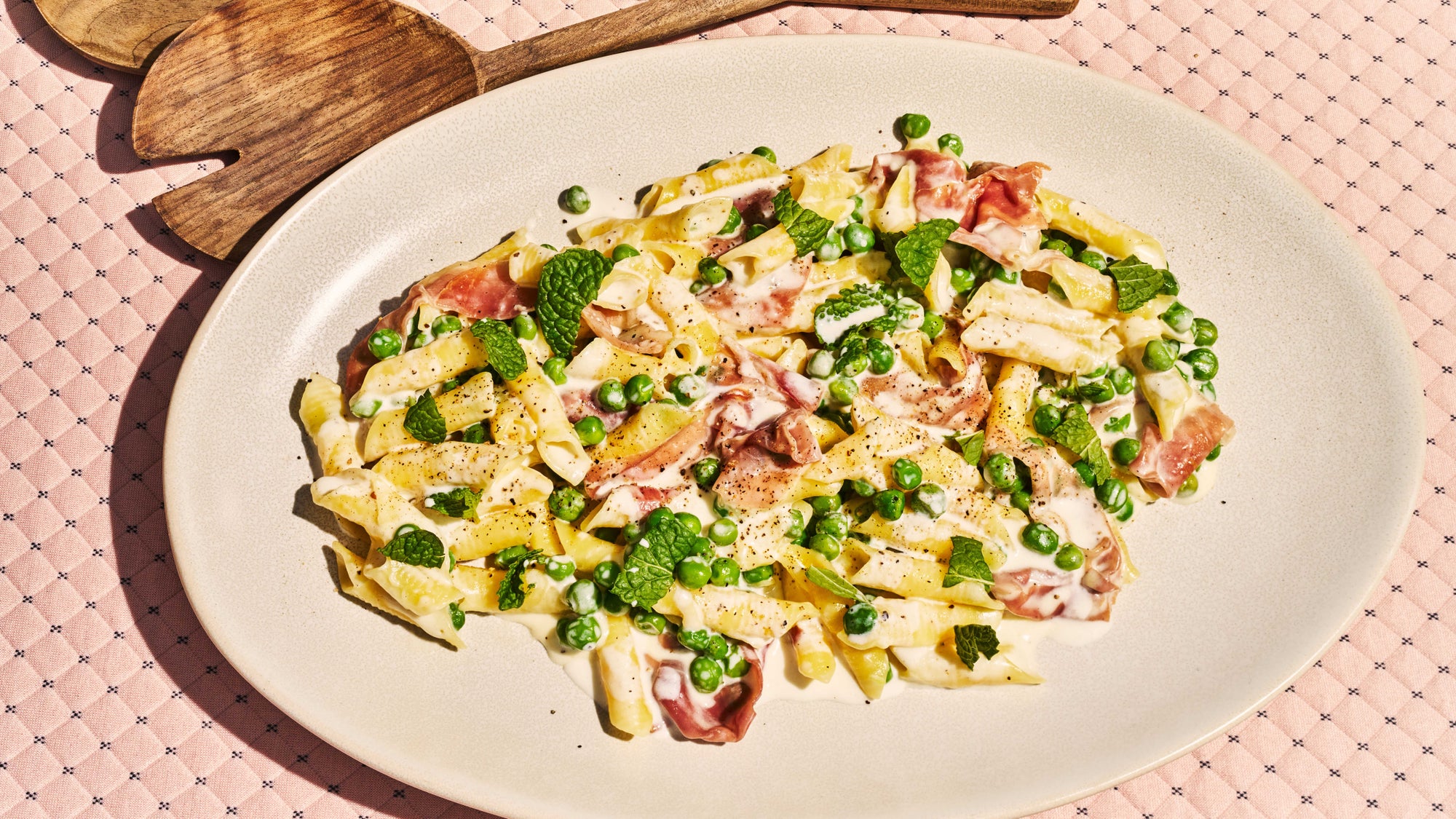 Švelnūs, plunksnos formos garganaliai supilami į kreminį padažą su saldžiais žirneliais ir Prosciutto di Parma kaspinėliais, kurie ištirpsta į makaronus ir suteikia subtilaus sūrumo ir mėsingo gylio. Šviežios mėtos suteikia pavasariško ryškumo, todėl kiekvienas kąsnis yra kvapnus, subalansuotas ir gyvas. Gaukite receptą >