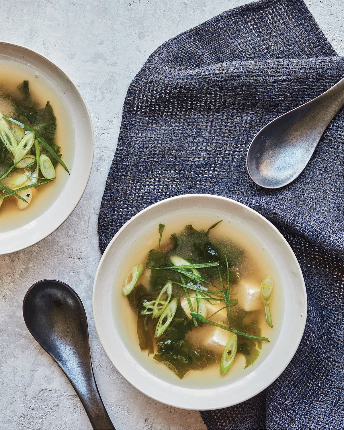 4. Grąžinkite daši į puodą ir užvirinkite ant vidutinės-stiprios ugnies. Kaitrą sumažinkite iki mažos, suberkite tofu ir troškinkite, kol sušils, maždaug 1 minutę. Išjunkite šilumą. Į nedidelį dubenį įpilkite miso, tada ant viršaus uždėkite šiek tiek dashi ir išplakite, kad ištirptų. Įdėkite mišinį į puodą ir švelniai maišykite, kol susimaišys. Sudėkite wakamą ir laiškinius svogūnus ir nedelsdami patiekite.