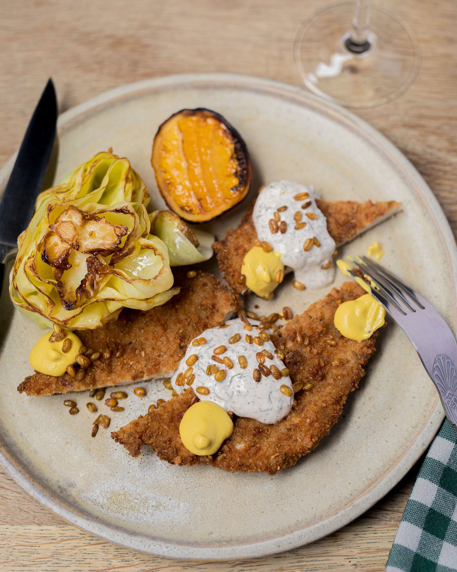 Supilkite karštą aliejų į karščiui atsparų dubenį, kad atvėstų prieš išmesdami. Popieriniu rankšluosčiu nuvalykite keptuvėje likusią duonos dalį, keptuvėje palikdami ploną aliejaus plėvelę. Vėl uždėkite ant stiprios ugnies, sudėkite citrinos puseles nupjauta puse žemyn ir virkite, kol lengvai sudegs, 4–6 minutes. Padalinkite šnicelį į šešias lėkštes, papuoškite krapais ir patiekite karštą su mėlynojo pelėsinio sūrio rančoje ir apdegusia citrinos pusele šone.