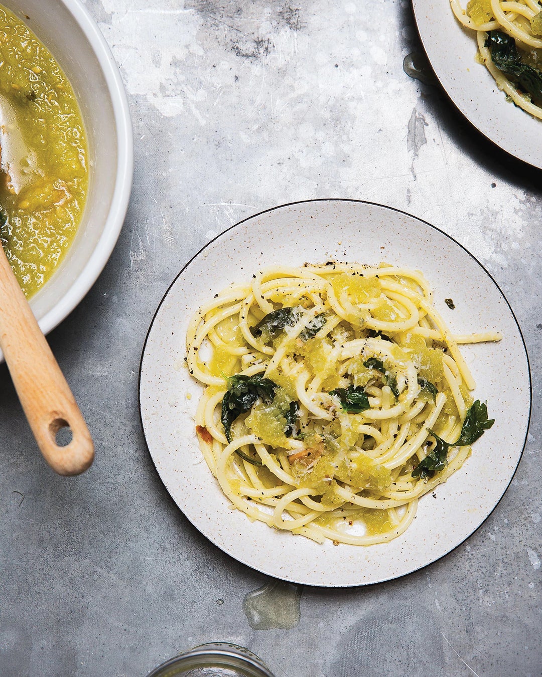 „Renkantis pomidorus dažniausiai lemia prinokimas. Vis dėlto kiekvieną vasarą stebiu tvirtus, neprinokusius žalius egzempliorius, kad pasigaminčiau vieną iš mėgstamiausių aštrių makaronų padažų. Net ir virti žali pomidorai yra aštrūs ir ryškūs, jie išlaiko nedidelį traškumą, o tai suteikia minkštiems makaronams tekstūros ir prilimpa prie traškios duonos. žalias pomidorų padažas, supilkite jį su karštais makaronais, kad pagamintumėte už jus. —Kristy Mucci