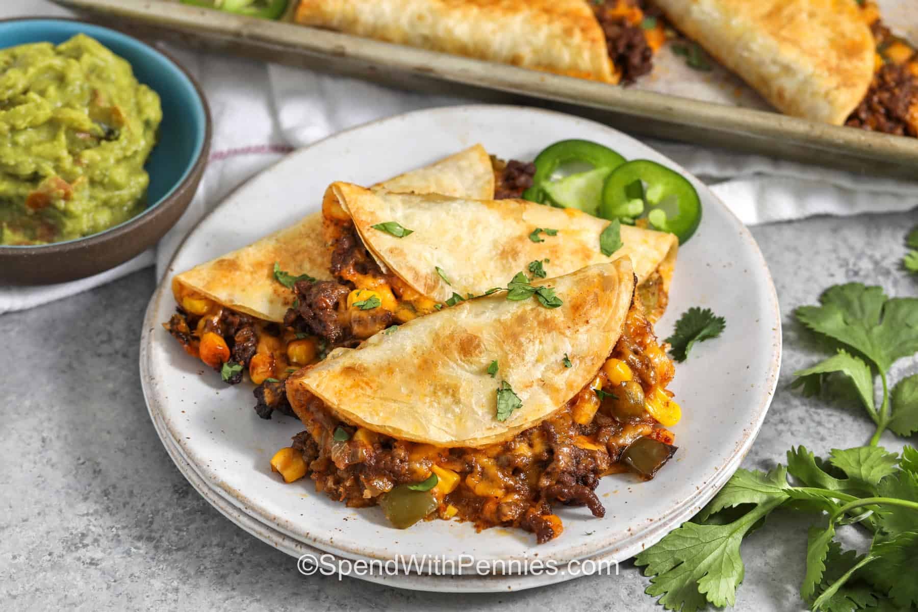 Vieną tortilijos pusę aptepkite alyvuogių aliejumi, tada apverskite, kad aliejumi patepta pusė būtų žemyn. Pagardintą jautienos mišinį ir sūrį paskirstykite ant kiekvienos tortilijos pusės ir užlenkite.